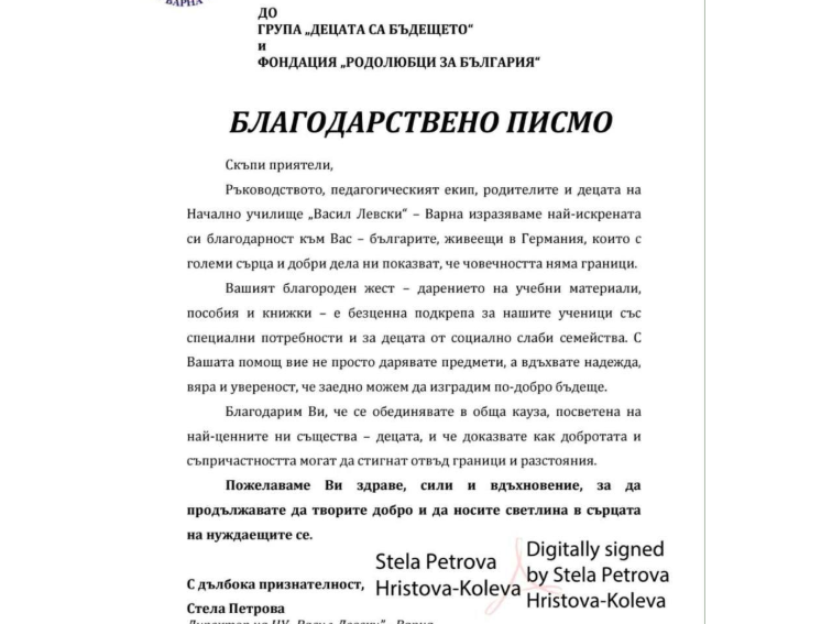 Три от пълните кашони бяха доставени в НУ „Васил Левски“ в кв. „Аспарухово“ – Варна. Лично директорката Стела Петрова прие даренията, а скоро след това беше получена благодарствена грамота за материалната помощ.
