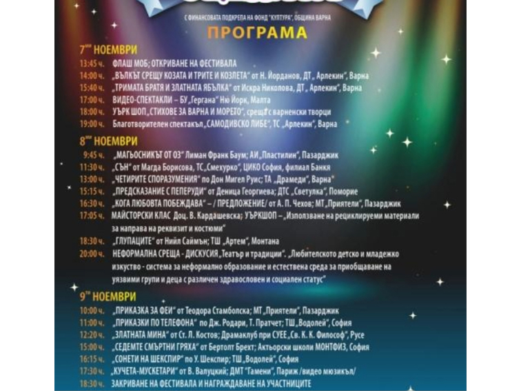 От 7 до 9 ноември Варна ще бъде домакин на осмото издание на Младежкия драматичен и музикално-театрален фестивал „Звезди на сцената“. Събитието се организира от Сдружение „Арлекин арт“ с подкрепата на Фонд „Култура“ към Община Варна.