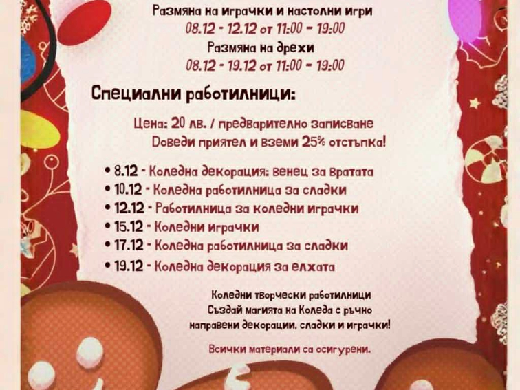 Първата инициатива – размяна на детски играчки и настолни игри – ще се проведе в периода от 8 до 12 декември, между 11:00 и 19:00 ч. Участниците могат да донесат запазени играчки и игри, от които децата им вече не се нуждаят, и да ги разменят за други.