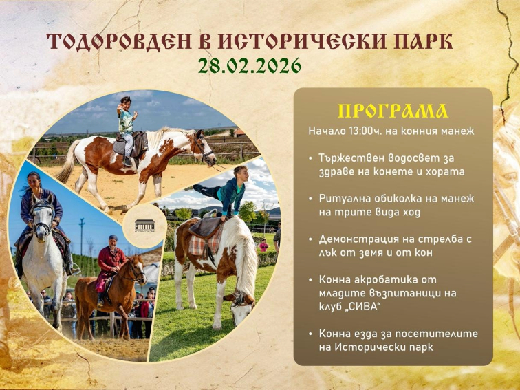 По повод празника Исторически парк организира тематична програма, посветена на традициите, свързани с Тодоровден и почитта към коня. Събитието ще предложи на посетителите възстановка на обичая, демонстрации на войнски умения и акробатика от гърба на кон.